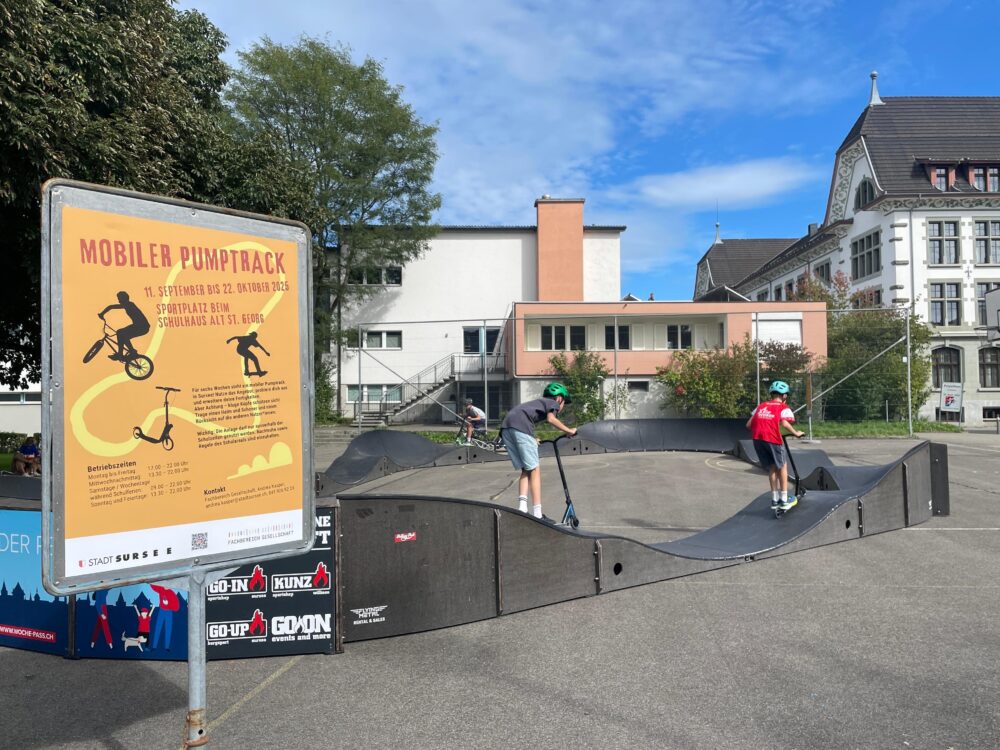 Seit einer Woche drehen begeisterte Kids und Erwachsene mit Velo, Skateboard, Scooter, Rollerskates oder Laufrad Runden auf dem mobilen Woche-Pass-Pumptrack. Die Anlage steht noch bis am 27. Oktober 2025 auf dem Basketballplatz beim Schulhaus Alt St. Georg.