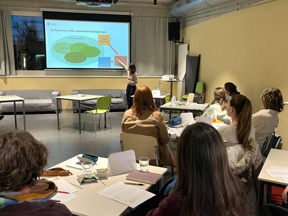 Zum Abschluss hatten interessierte Eltern und Erziehungsberechtigte die Gelegenheit, den Fachbereich Gesellschaft bei einer kurzen Vorstellung kennenzulernen und den Abend bei einem gemütlichen Apéro ausklingen zu lassen.
