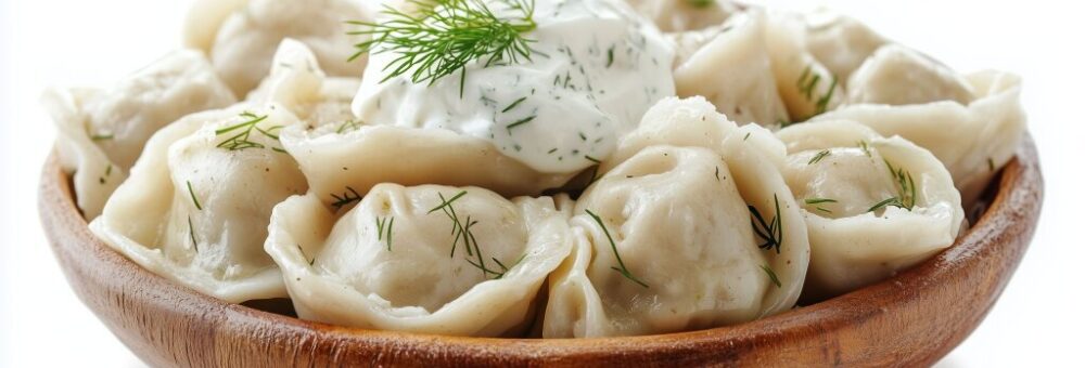 Hauptgericht vegetarisch: Wareniki (Teigtaschen gefüllt mit Kartoffeln und Steinpilzen, dazu Weisskohlsalat)