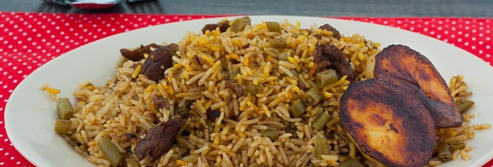 Hauptgericht Fleisch: Lubia Polo - afghanischer Reis mit grünen Bohnen, Karotten, Zwiebeln, Tomaten, Rindhackfleisch und duftende Gewürze, dazu Jogurt mit Gurken und Minze